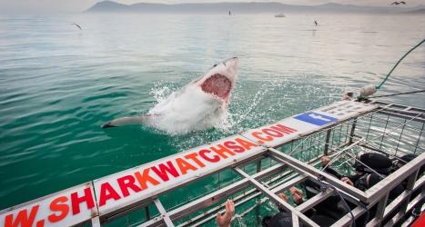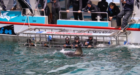 Geen duikervaring is nodig nie en jy sal nooit meer as ‘n meter onder die water wees nie, heeltemal beskerm in die metaalhok. Ons werk in vennootskap met Marine Dynamics wat die toer op ons luukse boot met die hulp van ‘n toegewyde marine-bioloog bestuur. Jy kan die haaie ook van ‘n dek op die boot, pleks vanuit die hok, besigtig.