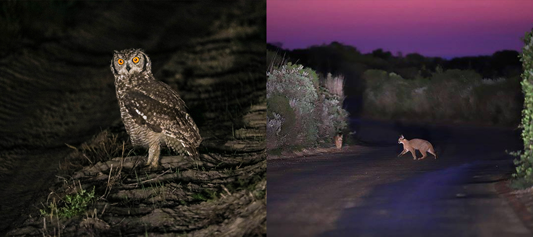 On your way back there is a chance you might encounter the movers and shakers of the night. As the headlights of the 4x4 light up the road ahead, the tufted ears of a caracal or bright orange eyes of an Cape-eagle owl might appear, just for long enough to make time stand still.